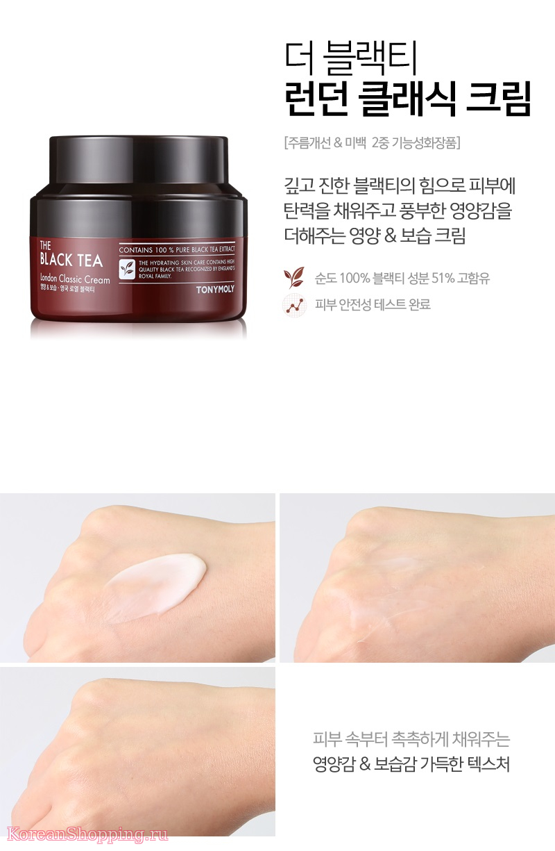 Антивозрастной крем для лица Tony Moly The Black Tea London Classic Cream содержит экстракт черного чая (51%), ниацинамид, пантенол, масло подсолнуха, масло бергамота, масло чайного дерева, аденозин, экстракт какао.